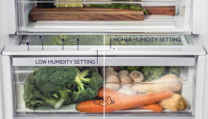 Ця модель холодильника має ящики з функцією Humidity Control. Функція контролює рівень вологості і створює оптимальне середовище зберігання. Закриваючи вентиляційні отвори, створюються ідеальні умови для зберігання овочів і зелені.